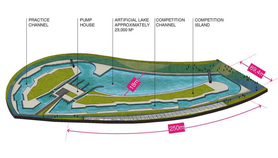 Como um sistema hidráulico de recirculação, o Estádio de Canoagem Slalom de Deodoro tira água de um reservatório de abastecimento (lago) proposto e entrega-o a uma bacia de partida para qualquer um dos dois canais de águas bravas operados independentemente. A água das bacias de partida desce os canais por gravidade, guiada por uma série de obstáculos ajustáveis modulares que criam as características individuais da água brava (por exemplo calhas, ondas, tampões, redemoinhos) e, finalmente, retorna novamente ao lago de abastecimento.