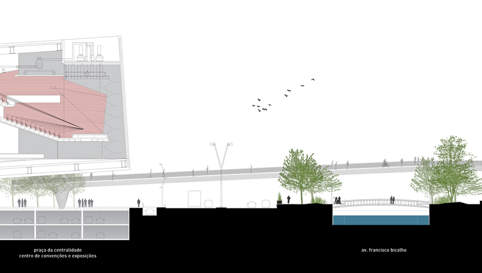 A outra área, caracterizada como a de centralidade, abrigaria hotel, centro de convenções e todo o aparato administrativo de apoio ao evento, os equipamentos de exceção e de escala metropolitana.