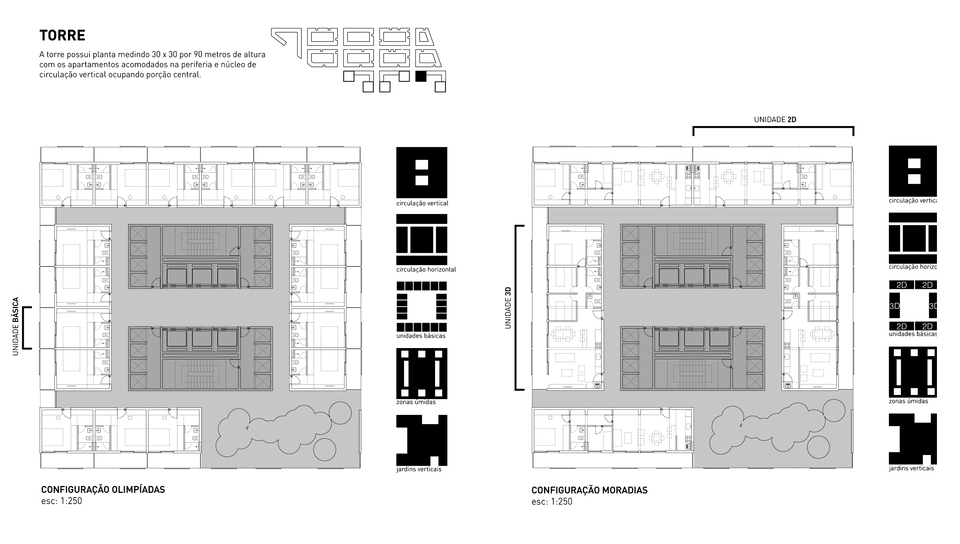A implantação se deu a partir de três situações programáticas e morfológicas: a área de habitação é uma delas, e corresponde à maior parcela, definida a partir da quadra de ocupação perimetral e das torres, que fazem a transição com o parque proposto. Aqui, as tipologias habitacionais foram concebidas como transformáveis após as Olimpíadas, para que se adaptassem às famílias e ao uso cotidiano.