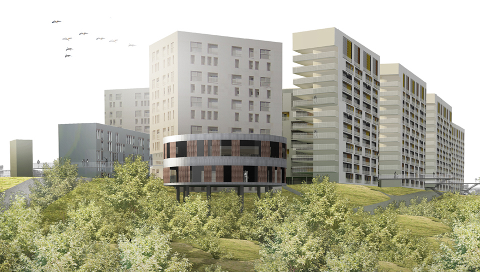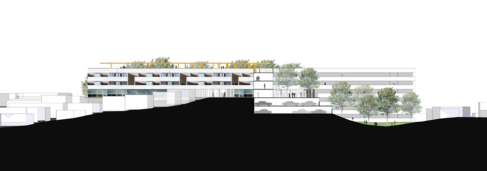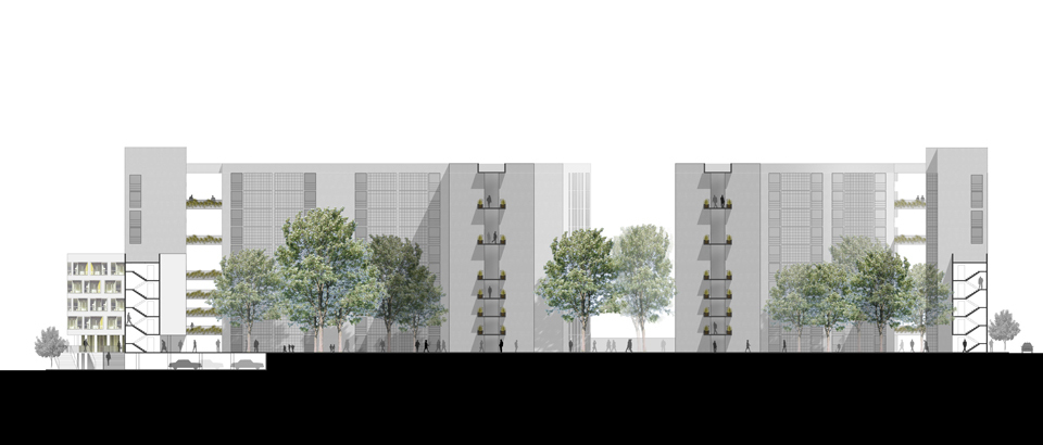 O edifício proposto oferece 178 novas unidades habitacionais. Aproveitando-se da situação em encosta, é possível atingir até nove pavimentos sem a necessidade de elevadores.