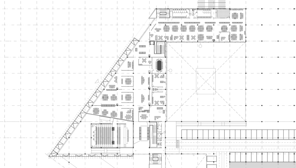 Em sua esquina aguda, uma ausência se faz presente e define o átrio de acesso, também entendido como praça coberta. Daí o usuário é conduzido ao interior do edifício de onde pode seguir até os espaços de trabalho ou dirigir-se ao foyer e o auditório.