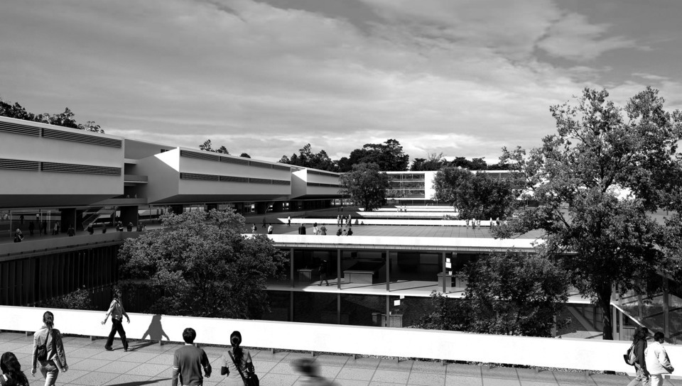 Em uma Universidade, as demandas são variáveis e exigem rápidas adaptações físicas. Com isso, eliminamos a ideia de escolas separadas e independentes: propusemos um conjunto de salas de aula e laboratórios em um bloco contínuo, utilizados conforme solicitação, sem necessidade de novas obras diante de alterações programáticas futuras.